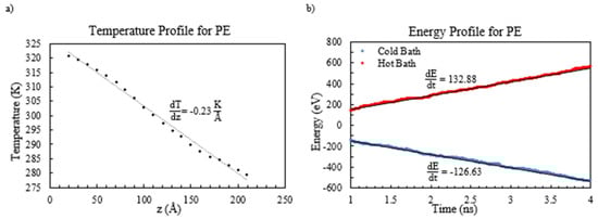 The energy profile depicted in Figure 4b is visually presented for analysis. The initial 10 million steps are intentionally omitted to emphasize the steady state condition. Considering the parameters above, the average thermal conductivity of amorphous polyethylene can be determined as 0.45 W/mK. This value aligns with the thermal conductivity observed in experimental studies on high-density polyethylene (HDPE) [43].