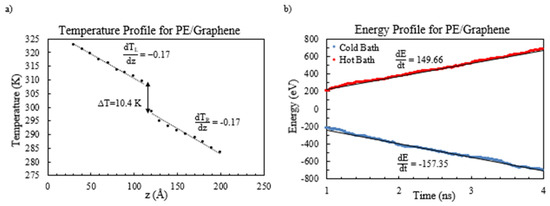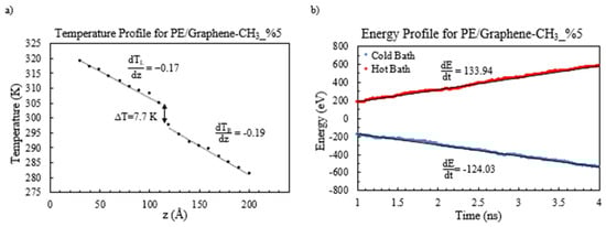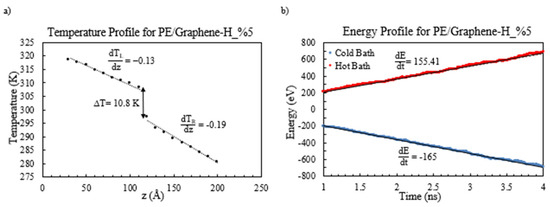 It is imperative to obtain an overall linear temperature gradient for calculating the PE/graphene nanocomposite thermal conductivity (as depicted in Figure 5a). The left and right sides of the interface display a temperature gradient of −0.17 K/Å. By analyzing the temperature gradients, it is determined that the temperature jump is equal to 10.4 K. The energy profile illustrated in Figure 5b represents the energy current flowing in the system. By calculating the average of the rates of energy transfer from both the hot and cold baths, one can derive the overall heat current as follows: