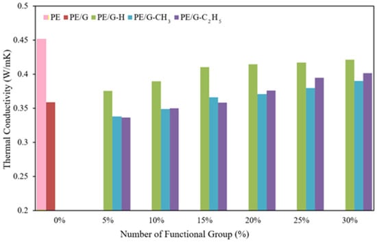 The results obtained for the PE/graphene material functionalized with methyl and ethyl groups exhibit a remarkable similarity. Upon closer examination, it is clear that the ethyl group demonstrates slightly more favorable outcomes, particularly when the concentrations are higher. It is worth mentioning, however, that these results fall short of those achieved through the functionalization process with hydrogen, with the latter yielding a 10% higher value in thermal conductivities (specifically at a concentration of 5%). Consequently, it is reasonable to assert that the functionalization with hydrogen resulted in higher levels of thermal conductivity. As the concentration increases, the thermal conductivity also experiences an upward trajectory. Conversely, the thermal conductivity is lower than that of non-functionalized graphene for lower quantities of methyl and ethyl groups. The functionalization with lower concentrations of these groups has a detrimental effect on the PE/G nanocomposite. We specifically note that the practical implementation of high concentrations of functionalization groups on graphene sheets is not feasible. In general, exceeding a concentration threshold of 30% does not yield any enhancements in material properties, as it is observed that the functionalization groups begin to distort the geometry and structure of the graphene sheet. This observation aligns with the results mentioned above, where it becomes apparent that the improvements diminish as the concentrations increase further.