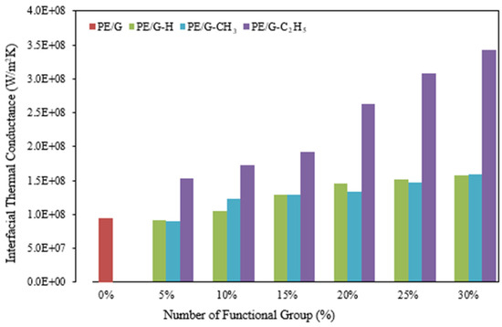 As depicted in the figure mentioned above, it is evident that the process of functionalizing graphene exhibits an affirmative influence on the interfacial thermal conductance of the nanocomposites. It is important to note that the impact of the ethyl group functionalization agent surpasses that of the other two functionalization agents. Once again, it should be emphasized that by augmenting the volume concentration of the functional groups, there is a growth in the interfacial thermal conductance.