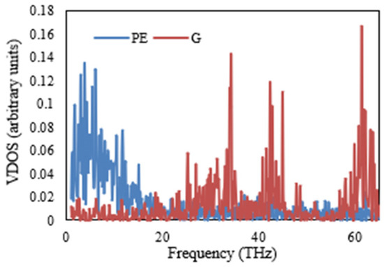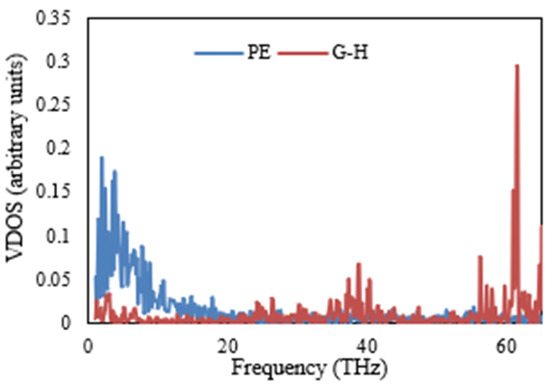 The VDOSs of the PE and various nanocomposites are illustrated in Figure 11, Figure 12, Figure 13 and Figure 14. Specifically, Figure 11 shows a significant discrepancy between the vibrational modes of the PE/G nanocomposite. This finding is repeated in Figure 12 and Figure 13, illustrating the VDOS of the PE/G-H and PE/G-CH3, respectively. In these figures, it is apparent that there is a poor coupling or connection between the materials at the interface, as indicated by the significant mismatch in vibrational modes. On the other hand, Figure 14 presents the VDOS of the PE/G-C2H5, and in this figure, it is observed that there is a close matching between the vibrational modes at the interface of these materials. This finding is in accordance and agreement with the results of the interfacial thermal conductance, as shown in Figure 10, which demonstrates that the interfacial thermal conductance of the PE/G-C2H5 nanocomposite is higher than that of the PE/G, PE/G-H, and PE/G-CH3 nanocomposites.