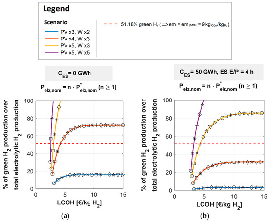 At the same ES energy capacity, when the ES power capacity is higher (Figure 6b), the green hydrogen production potential is lower because of the lower RE curtailment. For example, with = 100 GWh, the whole annual national demand can be produced from RE curtailment in the scenario PV×5W×5 if E/P = 8 h (purple star mark circled in green in Figure 6a), i.e., if the ES power capacity is 12.5 GW, a minimum overall electrolysis capacity of about 32 GW is required. Conversely, it cannot be produced solely from the curtailment if E/P = 4 h, i.e., if the ES power capacity is 25 GW (indeed, there is no purple star mark in Figure 6b at = 100 GWh). Analogously, in the scenario PV×5W×3, 50% of the annual national demand can be produced from RE curtailment with = 100 GWh if E/P = 8 h, i.e., the ES power capacity is 12.5 GW (yellow circle mark circled in green in Figure 6a), but not if E/P = 4 h, i.e., the power capacity is 25 GW (there is no yellow circle mark in Figure 6b at = 100 GWh).