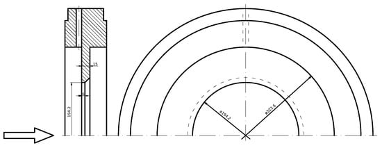 The results presented in this paper are derived from numerical calculations performed on a flow model of a measuring orifice. The schematic representation of the orifice is shown in Figure 1. The design and dimensions adhere to the ISO standard [13] for monolithic orifices. The flow conditions replicate those commonly applied in the chemical industry, including a broad range of variable parameters. The working fluid considered is steam, characterized by an average velocity of and a corresponding mass flow rate of . The nozzle is installed in a pipe with a nominal diameter DN 300, which corresponds to an internal diameter of . The contraction of the orifice, defined as the pipe diameter to the nozzle throat diameter ratio, equals . Temperature and pressure are also critical factors in the physical model. Given the application-oriented nature of the simulations, this study assumes high steam pressure of p = 8 × 106 Pa and a temperature of T = 400 °C = 673.16 K.
