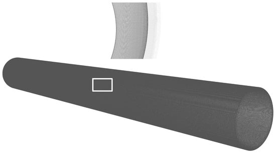 As observed, most boundary conditions are of Dirichlet type () or Neumann type (), where the domain boundary is oriented by the normal vector . However, these two conditions can lead to hydraulic wave reflections for compressible transient flows. To mitigate this effect, a Robin-type boundary condition [33] was applied to the pressure. The OpenFOAM toolbox [26,34] incorporates this condition within its wave transmissive setting, where the outlet pressure is determined using the equation described earlier, based on the assumed far field parameters: the distance of the far field from the boundary is , and the far field pressure is p0 = 8 × 106 Pa.