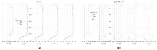 Solver validation was carried out using the velocity profiles obtained from the simulations. They are shown in Figure 3a and show good convergence of the velocity profiles in the k-ω SST 2006 model and relatively good in the standard k-ε model. The local entropy flux values also depend on the value of the viscous dissipation function, which can be well visualized from the stress tensor and the Reynolds stress tensor. In the comparison shown in Figure 3b, the best convergence is with the results for the Spalart–Allmaras model. Worse for the other two. For this reason, the choice of turbulence models was made and fell on the k-ω SST 2006 and Spalart–Allmaras models.