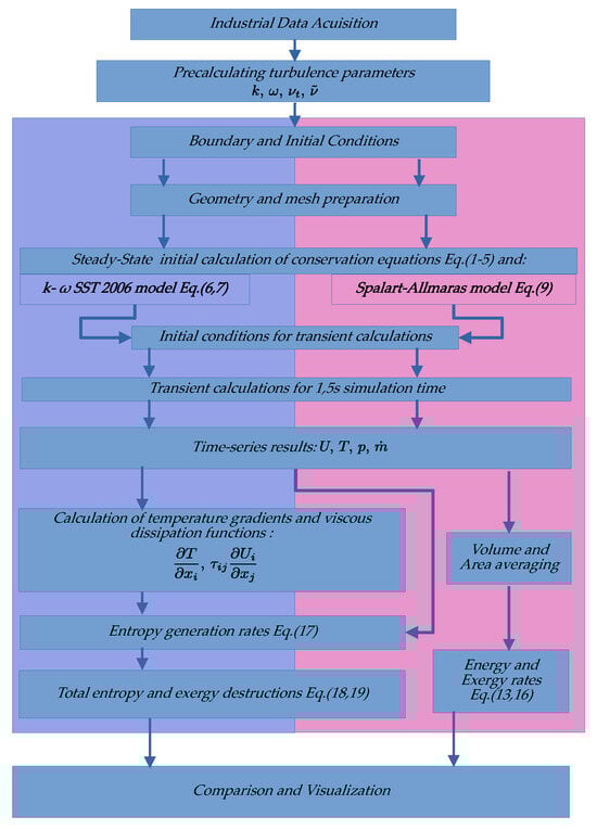 The process of simulation and determination of the values of the respective quantities is shown in the diagram in Figure 4. The calculations were performed in parallel for both turbulence models. The common parts are only data preprocessing, comparison and visualization.