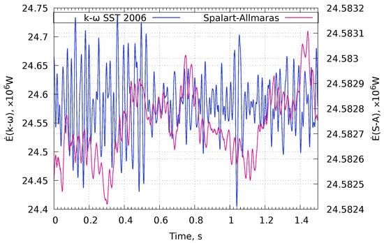 This section presents the results obtained from the relationships outlined in Section 2.7 and Section 2.8. Figure 5 illustrates the time evolution of total energy at the outlet of the orifice plate. The mean values of total energy flow rate and their standard deviations for both turbulence models are as follows: for the k-ω SST 2006 model, = 24,582.6 × 103 W with standard deviation ; for the Spalart–Allmaras model, = 24,582.7 × 103 W with standard deviation .