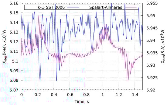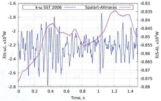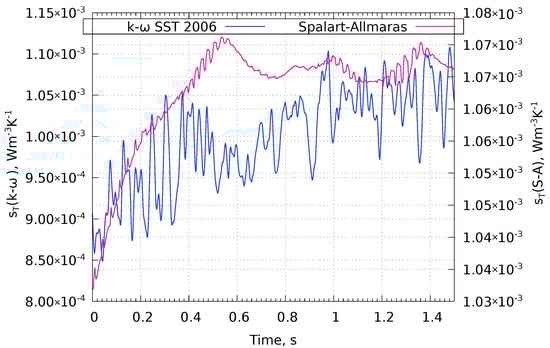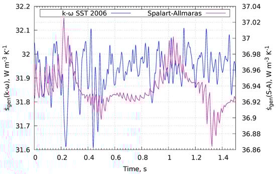 There are no significant differences in the local analysis of entropy generation rates, but the Spalart–Allmaras model tends to flatten the time series. At the same time, the k-ω SST 2006 model consistently produces oscillatory fluxes in both global and local analyses.
