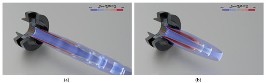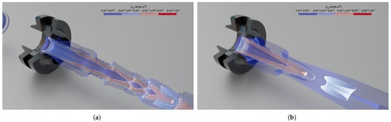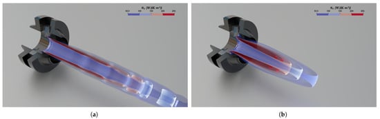 The method presented in the previous Section 2.8 allows the exergy value to be determined from global flow parameters such as mass flow, temperature and pressure. It is also possible to determine the entropy within the flow from values obtained during numerical simulations. The entropy generated during flow through the nozzle is a function of two mechanisms: viscous and/or turbulent dissipation and heat dissipation. Both mechanisms for fluid flows have been described mathematically in the literature [6,38,39].