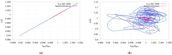 The dimensionless entropy production (), in this case, is for the model k-ω SST 2006 and for the model Spalart–Allmaras. As this case does not include heat generation from chemical reactions or heat exchange with the environment, these values can be compared to the results in Ref. [21], where flow in channels with different cross-sectional shapes is analyzed. The values given, which are in the range to , are lower, but the Reynolds number in that study is also lower, being in the range , and there is no heat transfer with the environment. In Ref. [22], where channel heating is considered, the author gives values for water and for oil , indicating an increase as a function of viscosity. Unfortunately, the Reynolds number is not given, but it is expected to be low. Therefore, the values obtained from the present investigation are reliable in the context of comparison to the studies reported in the literature.