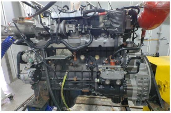 The experiments were conducted on a six-cylinder, four-stroke, turbocharged direct-injection hydrogen internal combustion engine equipped with an AMP 280-4C electric dynamometer (0–3200 rpm speed range) and a T40-F flange torque sensor for torque measurement. The engine featured an adjustable compression ratio (8:1–15:1, mechanically set to 9, 11, and 13 during testing), a displacement of 12.82 L, and a Bosch HDi-800 high-pressure direct injection system. Hydrogen was supplied from a 70 MPa storage tank through a Sierra C100 mass flow controller (±0.5% RD accuracy), while air intake was regulated by a Bronkhorst EL-FLOW Select thermal mass flowmeter (0–500 SLM range) in a closed-loop system. Tests were performed under controlled ambient (25 ± 1 °C) and coolant (80 °C) temperatures, with fixed ignition timing (15 °CA BTDC) and injection pressure (200 bar). λ spanned 1.0–5.0 in 0.5 increments. In-cylinder pressure was measured using a Kistler 6125C high-frequency sensor (0–250 bar range) sampled at 0.1 °CA resolution (±0.1% FS accuracy), complemented by a Horiba MEXA-7100DEGR multi-component analyzer for exhaust emissions (H2, NOx, COx; NOx resolution: 1 ppm). Engine speed was tracked via a Hengstler RVI58 photoelectric encoder, exhaust temperature monitored with an Omega KQXL-12G-K thermocouple, and data were collected over 50 consecutive cycles after 5-min stabilization periods. Each condition was tested thrice for statistical reliability, with trials terminated if the coefficient of variation of indicated mean effective pressure (COV_IMEP) exceeded 10% or abnormal combustion occurred. The main parameters of the engine are shown in Table 1. Figure 1 depicts the photograph of the test engine.