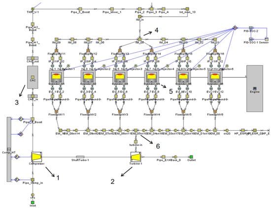 The verified engine model of GT-POWER v2022. 1: compressor, 2: turbine, 3: intercooler, 4: inlet manifold, 5: cylinder, 6: exhaust manifold.
