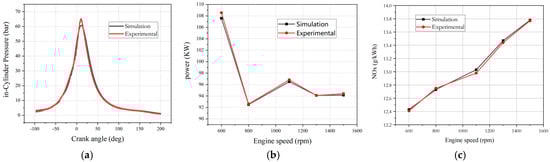 (a) In-cylinder pressure under simulation and experimental conditions; (b) power under simulation and experimental conditions; (c) NOx emissions under simulation and experimental conditions.