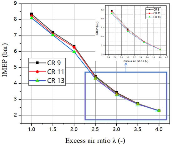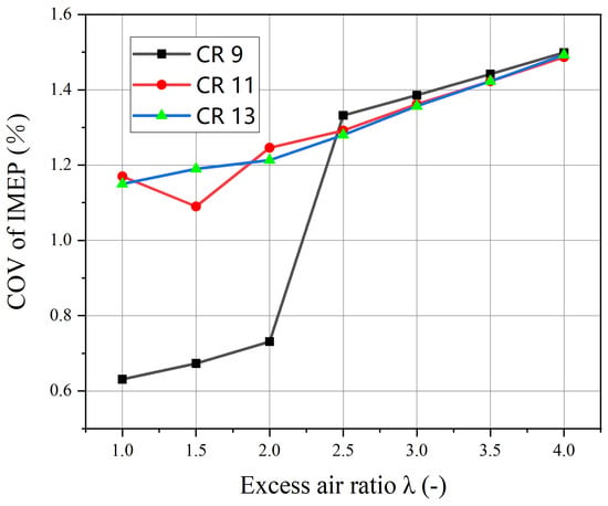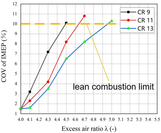 Figure 14 illustrates the influence of compression ratio on broadening the lean combustion limit, which is generally characterized by the COV of IMEP. When the COV of IMEP exceeds 10%, it indicates that the engine cannot operate normally, thus determining the lean combustion limit of the engine [37]. According to Figure 6, when λ < 4, the COV of IMEP remains well below 10%. However, when λ > 4.1, the rate of increase in the COV of IMEP rises significantly. Referring to Figure 14, it can be observed that at a compression ratio (CR) of 9, the lean combustion limit of the engine is approximately at λ = 4.5. When CR = 11, the lean combustion limit is around λ = 4.7, and at CR = 13, the limit shifts to approximately λ = 5.0. Therefore, it can be inferred that a higher compression ratio can broaden the lean combustion limit [29].