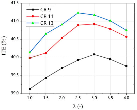 Indicated thermal efficiency (ITE) curves under different excess air ratios.