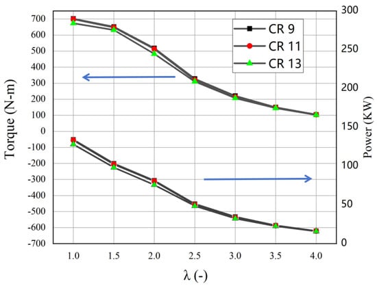 The present study comprehensively investigates the operational characteristics of the engine across varying λ, a key parameter determining combustion dynamics, under compression ratios of 9, 11, and 13. These compression ratios are consistent with those used in the experimental settings to ensure the accuracy of the simulation model. As depicted in Figure 4, the volumetric efficiency (VE), a key indicator of air intake performance, exhibits a pronounced dependency on λ under the predefined experimental configuration (intake pressure: 0.6 bar). A notable trend emerges wherein volumetric efficiency (VE) progressively declines as the λ increases from lean combustion conditions. The peak VE value coincides with stoichiometric combustion (λ = 1), aligning with theoretical expectations of optimal air utilization under balanced reactant proportions [22]. To illustrate, at a CR of 9, the maximum volumetric efficiency can reach 89.7%, a high efficiency rate indicating optimized engine performance. However, the minimum volumetric efficiency decreases to a lower rate of approximately 55%, signifying a substantial decrease of about 35%. This noteworthy decrease can be attributed to the fact that, although an increased excess air ratio positively impacts hydrogen combustion, facilitating complete combustion, the excessive air entering the intake port and the elevated gas flow velocity resulting from this complete combustion both contribute to the formation of turbulence or vortices in the intake system. These turbulences or vortices, in turn, increase the flow resistance, making it harder for air to enter the cylinder smoothly and ultimately reducing the volumetric efficiency of the engine [23]. Moreover, this decrease in volumetric efficiency becomes more pronounced as the compression ratio increases for the same λ. This is because the elevated cylinder pressure and temperature, which are inherent consequences of a higher compression ratio, create a greater impedance to the inflow of the air–fuel mixture into the cylinder, thereby reducing volumetric efficiency. These findings underscore the complex interplay of parameters in determining engine performance and highlight the need for precise control of air–fuel ratios for optimal engine functioning [24]. Compared with the hydrogen internal combustion engine with a CR of 10 in reference [13], the volumetric efficiency peak at λ = 1 in this study with CR = 13 (89.7%) is significantly higher than the reported value (82.3%), which is attributed to the optimized design of the turbocharging system. However, when λ > 3, the rate of decrease in volumetric efficiency (ΔVE/Δλ = −8.2%) is consistent with the observation by Nguyen et al. [13] (−7.5%), which validates the amplifying effect of the high compression ratio on the flow resistance of lean mixtures.