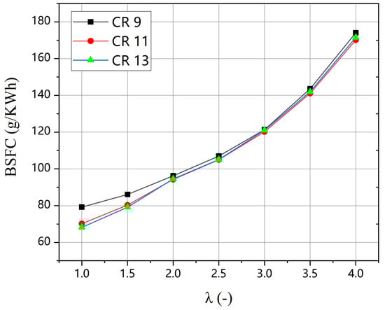 Figure 8 presents the variations of torque and power with the excess air coefficient, while Figure 9 demonstrates the changes in brake-specific fuel consumption (BSFC) as the excess air coefficient varies. As shown in Figure 8, torque and power gradually decrease as the excess air coefficient increases. Furthermore, under the same excess air coefficient, the power and torque values remain relatively consistent across different compression ratios, indicating that the compression ratio has minimal impact on power and torque. Conversely, Figure 9 reveals that fuel consumption initially reaches a minimum and then gradually increases with the increasing excess air coefficient. In conjunction with Figure 7, it can be observed that initial ITE variations are minor, but as the excess air coefficient increases, reaching the state of lean combustion, ITE, torque, power, and BSFC all deteriorate rapidly. Therefore, it can be concluded that excessively low excess air coefficients significantly reduce the fuel economy and power performance of hydrogen-fueled engines. As λ approaches the lean combustion limit, the thermal efficiency, torque, power, and BSFC across all compression ratios decrease significantly. This is attributed to the close proximity of the COV of IMEP values for CR13, CR11, and CR9.The arrow shows that the upper broken line stands for the torque chart, while the lower broken line represents the power chart.