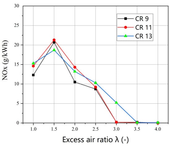 Figure 10 depicts NOx emissions from an engine, primarily depending on combustion temperature and intake air conditions. As illustrated, the NOx emissions initially rise and then decline, peaking around λ = 1.5. Beyond the critical threshold (λ > 2.5), NOx emissions exhibit a marked inverse correlation with the air–fuel equivalence ratio. This phenomenon arises from dual-phase thermal mechanisms: At moderate λ increments (1.0 < λ ≤ 2.5), enhanced oxidizer availability elevates both the adiabatic flame temperature and oxygen participation in nitrogen oxidation pathways. Conversely, when λ surpasses 2.5, the disproportionate oxygen-to-fuel ratio induces thermal quenching through two mechanisms—suppressed chain-branching reactions due to diluted reactant concentrations and accelerated heat dissipation from extended flame residence times in lean combustion regimes [34]. Since NOx formation is closely related to combustion temperature, a decrease in combustion temperature can effectively reduce NOx emissions. Furthermore, an increased excess air ratio aids in improving combustion stability, minimizing fluctuations and instabilities during combustion, reducing NOx emissions. Under fuel-rich combustion conditions (λ < 1.0), transition metal catalysts demonstrate effective NOx abatement through surface-mediated redox reactions. This catalytic strategy leverages the inherent chemical potential of unburned hydrocarbons in oxygen-deficient environments, where the catalyst substrate facilitates NOx decomposition into molecular nitrogen via selective oxidation pathways [35]. The increase in NOx emissions with higher compression ratios is closely related to the rise in in-cylinder temperature and changes in oxygen concentration distribution. Although thermal NOx (via the Zeldovich mechanism) is likely to be the dominant contributor, detailed reaction kinetics analysis combined with more refined CFD simulations will be a focus of future work.