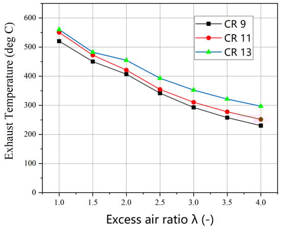As shown in Figure 11, with an increased λ, a continuous exhaust temperature decrease is observed, and a higher compression ratio results in a greater exhaust temperature. When λ exceeds 2.5, exhaust temperatures under various compression ratios are all below 300 °C, during which NOx emissions significantly decline. Hydrogen-powered engines operating under stoichiometric conditions (λ ≈ 1) exhibit minimal NOx formation due to combustion characteristics. Residual hydrogen in exhaust streams functions as an active reductant in three-way catalytic systems, enabling synergistic emission control through in situ chemical utilization. This integrated approach enhances both pollutant conversion efficiency and the thermodynamic performance of hydrogen combustion systems [36].