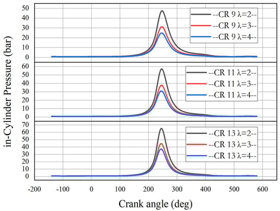 A higher R-squared coefficient (approaching 1) indicates improved congruence between computational results and experimental measurements [21]. As shown in the figure, the goodness of fit (R2) between the simulated and experimental values of in-cylinder pressure is 0.989, and the R2 for the simulation and experimental values of power is 0.991, and the R2 for the simulation and experimental values of NOx is 0.982. The NOx model was calibrated under experimental bench constraints: Initial wall temperature, intake pressure (0.6 bar), and coolant temperature (80 °C) were fixed according to experimental measurements without manual modification. The Woschni heat transfer coefficient C1 was dynamically optimized by matching in-cylinder pressure traces (R2 > 0.98), while parameters in the Zeldovich mechanism were iteratively adjusted within physically permissible ranges (±10% of default values) using 15 experimental datasets (λ = 1–3). The calibrated model achieved a NOx prediction deviation < 8% (R2 = 0.982) within the tested operating range. For ultra-lean conditions (λ > 3), predictions were extrapolated based on exhaust temperature trends and cross-validated to avoid overfitting. Based on these results, it can be concluded that the simulation outcomes are basically consistent with the experimental results. The reliance on simulation results stems from experimental limitations in safely exploring ultra-lean (λ > 2.5) and high compression ratio (CR > 11) conditions due to risks of misfire, knock, and hardware damage. While experimental data validated the model’s accuracy, simulations enabled systematic, risk-free analysis of 45 parameter combinations (3 CR × 15 λ) with 0.1 °CA resolution, providing insights beyond physical testing constraints.