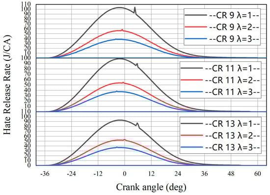 As depicted in Figure 12, elevated compression ratios (CRs) induce a 23% rise in peak combustion pressure and a 8.5 °CA advancement in pressure phasing. These trends correlate with intensified thermodynamic conditions within the chamber, where higher CR values enhance end-gas reactivity, thereby achieving near-complete fuel conversion. Additionally, elevated λ correlates with diminished maximum combustion chamber pressures and retarded peak phasing. This thermal attenuation stems from over-lean mixtures lowering reaction intensities, as evidenced in Figure 13’s heat release profiles mirroring pressure characteristics. The analysis further reveals compressed ignition dwell periods and advanced combustion timing under heightened compression ratios. Notably, heat release trajectories display nonlinear progression with abrupt escalation phases, which attenuate markedly under lean-burn configurations. These combustion dynamics suggest that while elevated compression ratios intensify thermal–mechanical loads, they concurrently impair hydrogen–air mixing homogeneity, elevating risks of localized fuel enrichment and combustion anomalies like post-ignition detonation. However, an increased excess air ratio suppresses the likelihood of hydrogen accumulation in certain regions, thus reducing the occurrence of abnormal combustion.