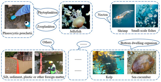 In order to ensure the safety of the water intake, hazardous floating bodies [15,18,39,59,60,61] should be removed in a timely manner. Figure 3 shows the main hazard floating bodies and their classification.