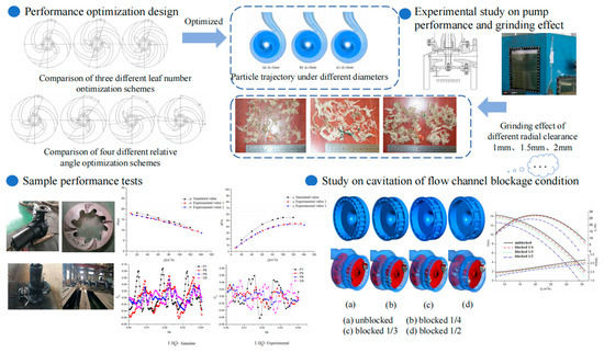 To effectively deal with various marine organisms, such as kelp [39,61], several meters in diameter and several meters in length, and jellyfish [15,59], half a meter in diameter and half a meter in diameter, and so on, a pump product with cutting and grinding functions is being developed to cut or grind kelp, jellyfish, debris, etc., and then transport them. Experts and scholars have improved the cutting and grinding technology through design optimization by optimizing the design and other measures. These measures include but are not limited to performance optimization design, prototype performance testing, experimental research on pump performance and grinding effect, and cavitation research. Figure 4 shows the main measures taken to improve the cutting or grinding technology of floating bodies.