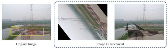To evaluate the effectiveness of the improved model, we use the Chinese Power Line Insulator Dataset (CPLID) [43], an open-source dataset (available at: https://github.com/InsulatorData/InsulatorDataSet (accessed on 23 March 2025)) designed explicitly for detecting power line insulator defects. This dataset includes 600 normal insulator images and 248 synthetically generated defective insulator images, yielding a total of 848 images. It features two labels: “insulator string” and “insulator defect”. As depicted in Figure 7, we employ various data augmentation techniques—such as random cropping, flipping, and color perturbations—to enhance model generalization. This process triples the number of original images. The expanded dataset is then divided into a 7:2:1 ratio, resulting in a training set of 1780 images, a test set of 509 images, and a validation set of 255 images.