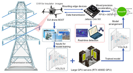 Schematic diagram of the technical route for real-time detection of power insulation based on YOLOLS model and edge computing.