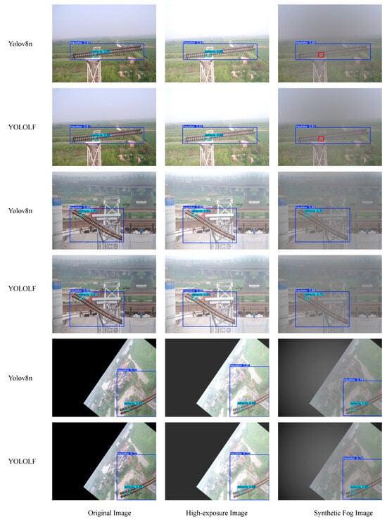 Figure 10 presents the detection results of both models across different scenarios. From left to right, the images depict the detection results on original images, high-exposure environments, and synthetic fog conditions, respectively. In Figure 10, red bounding boxes highlight missed detections. It is evident that in synthetic fog environments, smaller insulator defect targets are more likely to be obscured, leading to false negatives. However, in most cases, both models effectively identify insulators and defect regions, and their detection performance remains comparable. Despite its lightweight design, YOLOLS maintains robustness comparable to YOLOv8n, effectively handling complex environmental conditions. It demonstrates strong adaptability to high-exposure environments and maintains high detection accuracy under foggy conditions. These results confirm that YOLOLS is suitable for real-world insulator defect detection applications, ensuring efficient and reliable performance in challenging scenarios.