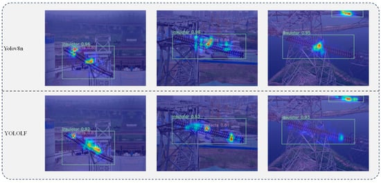 Lastly, we generate feature-layer heatmaps using HiResCAM [48] for the 10th, 12th, 14th, 16th, and 18th layers of YOLOv8n and YOLOLS to visualize each network’s attention distribution (Figure 11). The brightness variations in these heatmaps indicate the degree of attention the model assigns to specific regions. As illustrated in Figure 11, both YOLOLS and YOLOv8n successfully detect insulators with high accuracy. Although YOLOLS exhibits a slightly lower confidence score, both models focus on the critical features of insulators, resulting in comparable overall detection performance. For insulator defect detection, the performance of both networks remains nearly identical. However, YOLOLS demonstrates a more precise focus on defect characteristics, indicating that despite its lightweight architecture, its defect detection capability is not compromised.