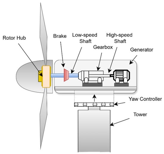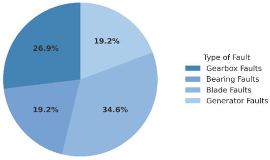 Wind turbines consist of several components that work together to generate electricity, and a fault in any component can ultimately affect the overall operation of the turbine. As illustrated in Figure 3, the key components include the gearbox, generator, blades, and several others [64]. This review specifically focuses on faults related to the gearbox, generator, blades, and bearings as they are the components most addressed in the literature. Figure 3 shows the percentage of papers that address each fault in this review paper. Each piece of literature typically covers a specific fault, but some studies address multiple faults.