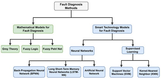 Fault diagnosis in wind turbines employs various methods, combining traditional approaches with advanced mathematical models and smart technology models, as shown in Figure 4. This section delves into the utilization of mathematical models, including Fuzzy Logic [65], Gray Theory, and Fuzzy Petri Net (FPN) [66], as well as smart technology models such as ANNs, SVMs, and DL.