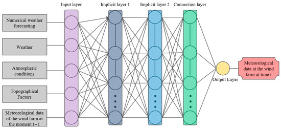 The artificial neural network mainly builds a mapping model between the actual historical information input and the predicted data output, as shown in Figure 1. Based on the historical data, the model can be obtained by training various environmental parameters of the turbine location with the wind speed or output power at the next moment, but it lacks the consideration of the time correlation of the data series, so it has a limited effect on the prediction of wind power under complex meteorological conditions.