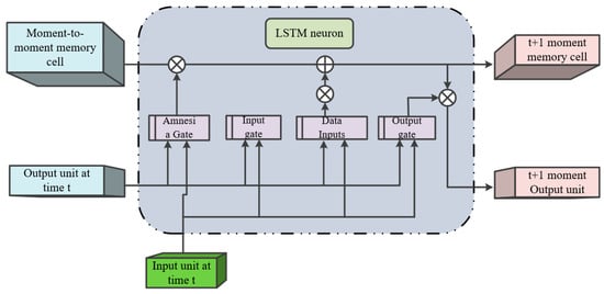 Deep learning is currently a more advanced method in wind power prediction. Compared with ANN, deep learning has a very good learning effect when the amount of data is very large. Convolutional neural networks (CNNs) [20] and recurrent neural networks (RNNs) [21] are currently more mature deep learning methods. CNN uses convolution and pooling for feature selection, which reduces the number of features, but it can only process individual inputs individually, and thus is usually used for processing images and cannot be used for processing sequential data. Connections between neurons in the hidden layer of an RNN are also established, and the previous moment’s hidden layer state is output to the current hidden layer unit, which in turn affects the current moment’s output, so RNN is better for processing time-series-related sequences; it is better for short-term prediction, and limited in dealing with long time sequences. Based on the RNN model was then developed a more advanced Long Short-Term Memory (LSTM) artificial neural network [22], as shown in Figure 2: the LSTM proposes a gate mechanism for the filtering of the unit state data, so it can handle long time sequences. Gated Recurrent Neural Network (GRU) is a modification of LSTM, which has only two gates, a simpler structure, faster training and better results when used for power prediction.