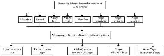 In the first step, information on the correlation between microtopography and wind turbine blade ice cover is collected by combining the specific geographic situation of the location of the large-scale wind farm, and the extraction of slope, slope direction, terrain undulation and valley line ridgelines are realized through surface flow simulation to extract various types of ground line features of microtopography. Combining the DEM of the location of the large wind farm, the micro-terrain factors are extracted. The microtopographic factors (focusing on the strong significance factor) are calculated and analyzed statistically to obtain the microtopographic area classification standard for large wind farms, as shown in Figure 6.