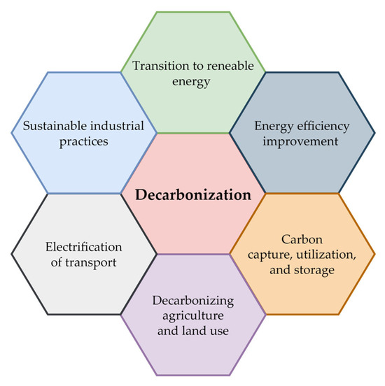 Decarbonization is a complex process that can be achieved based on collaborative efforts from governments, industries, and individuals through different approaches focused on energy transition and sustainable industrial and transportation practices (Figure 1).