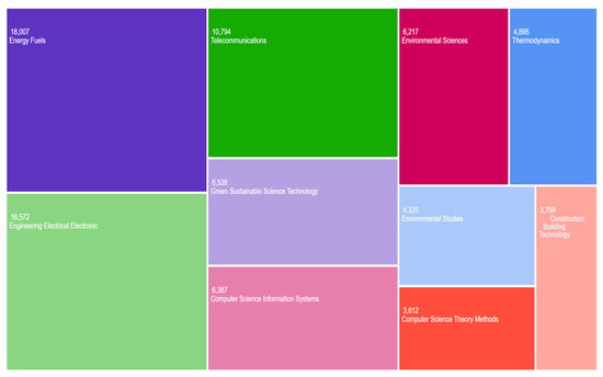 The complexity of the phenomenon of decarbonization of the economy and the impact of reducing energy consumption and increasing energy efficiency in the transition to a low-carbon economy is demonstrated by the scientific fields in which the articles have been published (Figure 4).