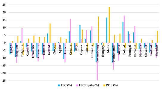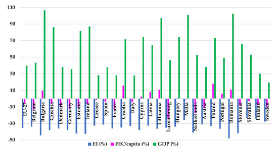 Energy intensity decreased in all the EU countries, with values ranging between 23.53% (Slovakia) and 47.92% (Romania). Rates of reduction over 40% were also registered in another four countries, namely Bulgaria (44.26%), Ireland (42.26%), Estonia (42.12%), and Slovenia (41.79%). Simultaneously, the GDP increased in all EU states, with rates ranging from 19.54% in Sweden to 106.79% in Bulgaria. Rates over 100% were registered in Romania (102.36%) and Malta (100.97%). Therefore, in all the EU member states, the high economic growth was doubled by a significant increase in energy efficiency. Comparatively, the final energy consumption per capita decreased in 18 out of the 27 analyzed countries with rates of 0.76% (Malta) to 24.71% (Luxembourg), while in the other nine countries, the FEC/capita increased with values ranging between 0.57% (Hungary) and 17.9% (Poland), as presented in Figure 6.