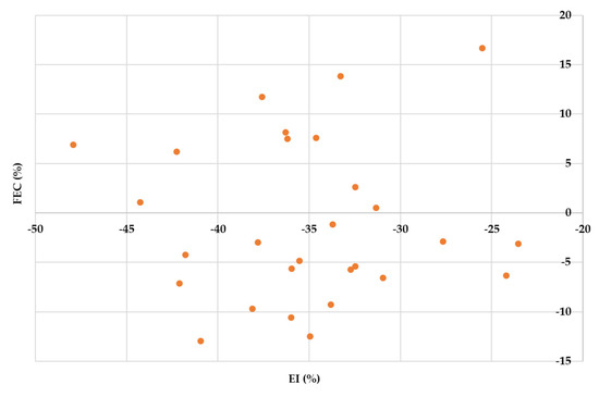 The value of the correlation coefficient between FEC (%) and EI (%) is 0.0137, underlining a non-significant positive relationship between the analyzed variables (Figure 7).