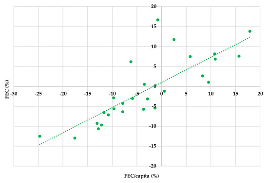 As underlined above, only 1.37% of the variation in FEC is explained by the change in energy efficiency reflected by the energy intensity of GDP in PPSs calculated by Eurostat (EI). Comparatively, the high value of the correlation coefficient (0.8054) between FEC (%), as a dependent variable, and FEC/capita (%), as an independent one, shows a powerful positive relationship between them. Thus, the change in FEC/capita explains over 80% of the variation in final energy consumption (Figure 8).