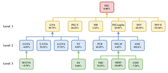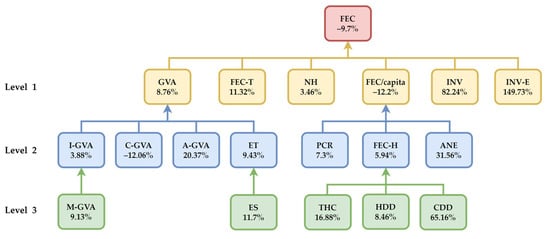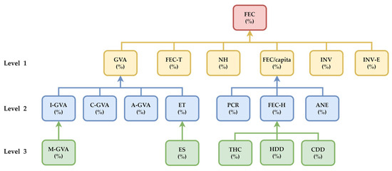 Based on the highest correlation coefficient values, we developed a model (pattern) on three levels that show the relationships between the variation in final energy consumption and its driving forces (Figure 9).