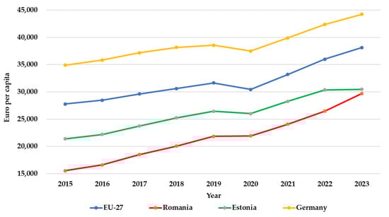 - Eurostat. Gross Domestic Product (GDP) and Main Components per Capita, nama_10_pc. 2025. Available online: https://ec.europa.eu/eurostat/databrowser/product/page/NAMA_10_PC (accessed on 17 January 2025).
