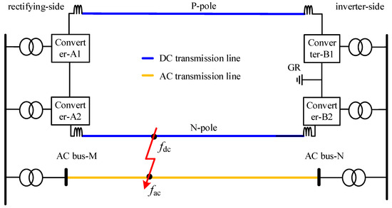 When the AC transmission lines in the transmission channel are transformed into HVDC lines, the AC and DC transmission lines are arranged and crossed closely with each other. At this time, the occurrence of intersystem faults increased. In this paper, the faults occurring in DC or AC systems are classified as non-intersystem faults, and the faults occurring between AC and DC are classified as intersystem faults. Taking the parallel DC and AC transmission lines in Figure 2 as an example, when intersystem faults occur, the AC/DC system has direct electrical coupling through the fault point and the fault point . During a fault transient, the transient characteristics of AC and DC systems can no longer be analyzed separately. New electrical features may pose challenges to the adaptability of traditional protection.