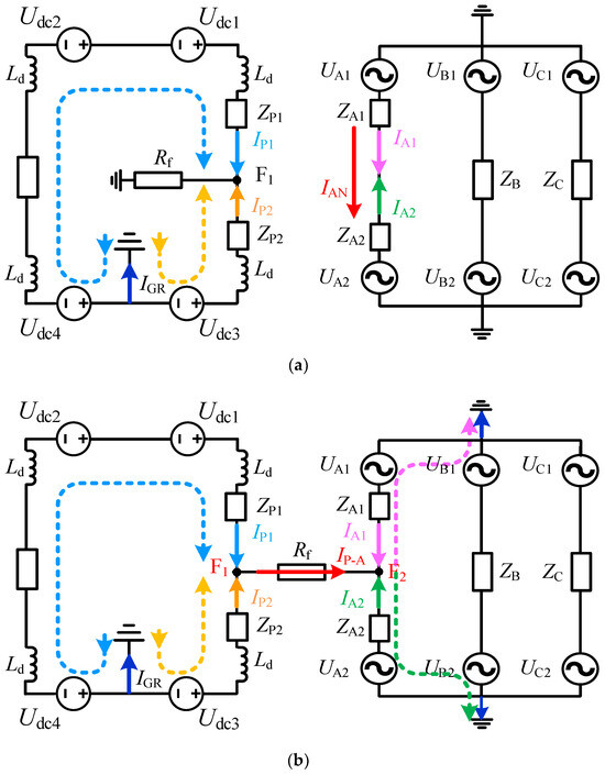 According to the research conclusion in the literature [11], among the various types of intersystem faults, a pole-phase intersystem can be identified as most critical with respect to protection. Therefore, taking the typical pole-phase intersystem (P-pole-to-A-phase fault) as an example, the current characteristics of AC and DC lines are analyzed. The current distribution of a DC single-pole ground fault and an intersystem fault is shown in Figure 4, and the is current flowing through the DC neutral point.