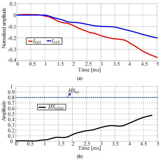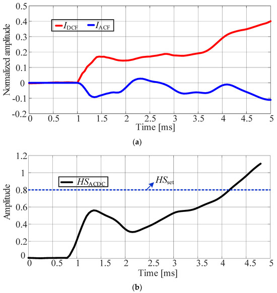 In the fault scenario in which , the waveforms of and fluctuate greatly, but the trend change is similar, and the maximum is not more than 0.5. Comparing Figure 9 and Figure 10, it can be seen that the protection performance is not affected by the initial fault phase angle. For different fault phases, the maximum value of in the protection window is relatively close.