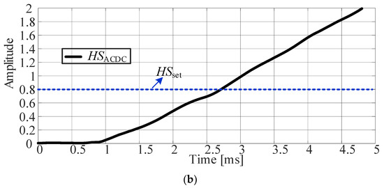 where is the Hausdorff distance result of and substituted into Equation (11), which is used to characterize the similarity of currents on both sides. is the threshold value of current similarity. The setting principle of the protection threshold is to avoid the fault scenario that is most unfavorable to protection. In this paper, it is manifested as the non-intersystem fault at the near-area. When applied to different AC and DC power systems, the impact of system parameter differences on the selection of threshold values and the suggestions for threshold adjustment are summarized as follows: (a) Distributed capacitors will weaken the similarity of two groups of current waveforms in fault scenarios between systems. Since the size of distributed capacitors is positively correlated with the length of the lines, it is considered to raise the threshold value when the line length is longer. (b) The size of the DC reactor will affect the traveling wave reflection in the early stage of failure, and when the value of the reactor is reduced, the threshold value can be lowered. (c) The rated voltage of the AC/DC system will affect the initial fault state. When the difference between the two rated voltages is larger, the waveform difference is larger, and a higher threshold value should be selected; otherwise, a smaller threshold value is selected.