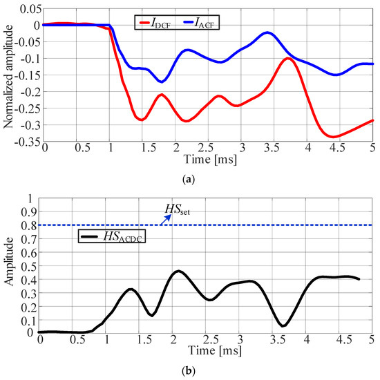 As shown in Figure 4a, when the DC ground fault occurs, the current on both sides of the P-pole is and . Obviously, since and are in different circuits, the existence of is not equal to . At this time, the load current flows through both sides of AC phase-A, and the waveform of is the fault transient oscillation mode, while the waveform of is the fundamental frequency sine wave, and there is a big difference between the two waveforms.
