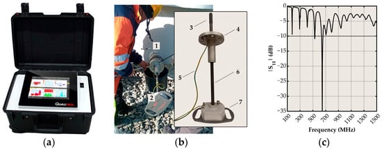 Online PD monitoring using the UHF method. (a) Photograph of the Qualitrol Portable PDM system used in the tests. (b) Photograph showing the installation of the Qualitrol CMD01591 antenna in one of the tested power transformers: 1—oil drain valve; 2—antenna; 3—active part of the antenna (7.5 cm long rod with oil-resistant, rubber protective coating); 4—mounting flange with an internal O-ring; 5—potential equalization cable; 6—rod for adjusting the antenna installation depth; 7—mounting bracket with RF connector. (c) Frequency response of the Qualitrol CMD01591 antenna showing the S11 parameter.