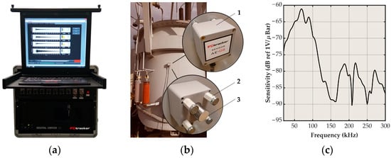 Online PD monitoring using the AE method. (a) Photograph of the 8-channel PDtracker Portable acoustic emission system used in transformer testing. (b) Photograph and components of the A6890 ultrasonic transducer: 1—integrated preamplifier (0–60 dB); 2—magnetic holder; 3—front part of the transducer. (c) Frequency response characteristics of the A6890 transducer.